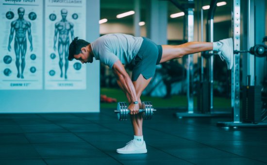 Stand on one leg, hugging a dumbbell or kettlebell to the opposite shoulder for resistance. Hinge at the hip with your free leg moving behind you as you lower the weight toward the floor. Maintain neutral spine throughout.
